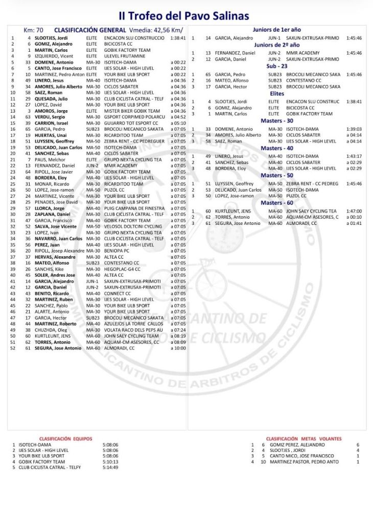 Slootjes gana también entre los élites; Pedro García (Brócoli) ha sido el mejor Sub 23; Antonio Domene (Isotech-Dama) se ha impuesto en M30; Jesús Linero (Isotech-Dama), en M40; Geoffrey Luyssen (Zebra Rent), en M50; y Jens Kurtleunt (John Saey), en M60; Alejandro García (Saxun Extrusax-Primoti), en júnior 1; y Daniel Fernández (MMR).