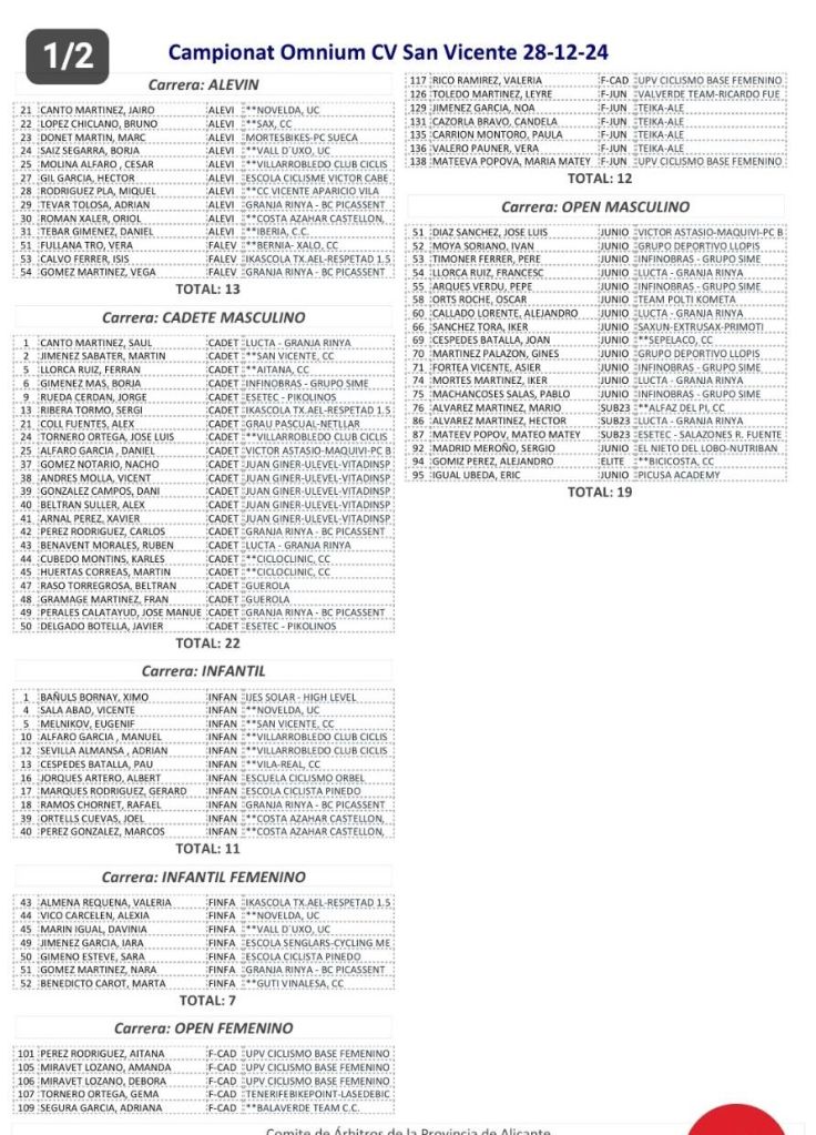- Categorías: Sub23 Fem., Sub23, Paraciclismo, Master 60 Fem., Master 60, Master 50 Fem., Master 50, Master 40 Fem., Master 40, Master 30 Fem., Master 30, Junior Fem., Junior, Infantil Femenino, Infantil, Elite Fem., Elite, Cadete Fem., Cadete, Alevin Femenino, ALEVIN, Pista