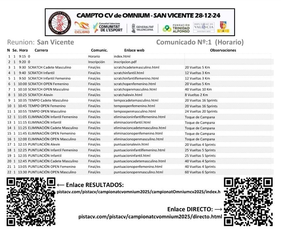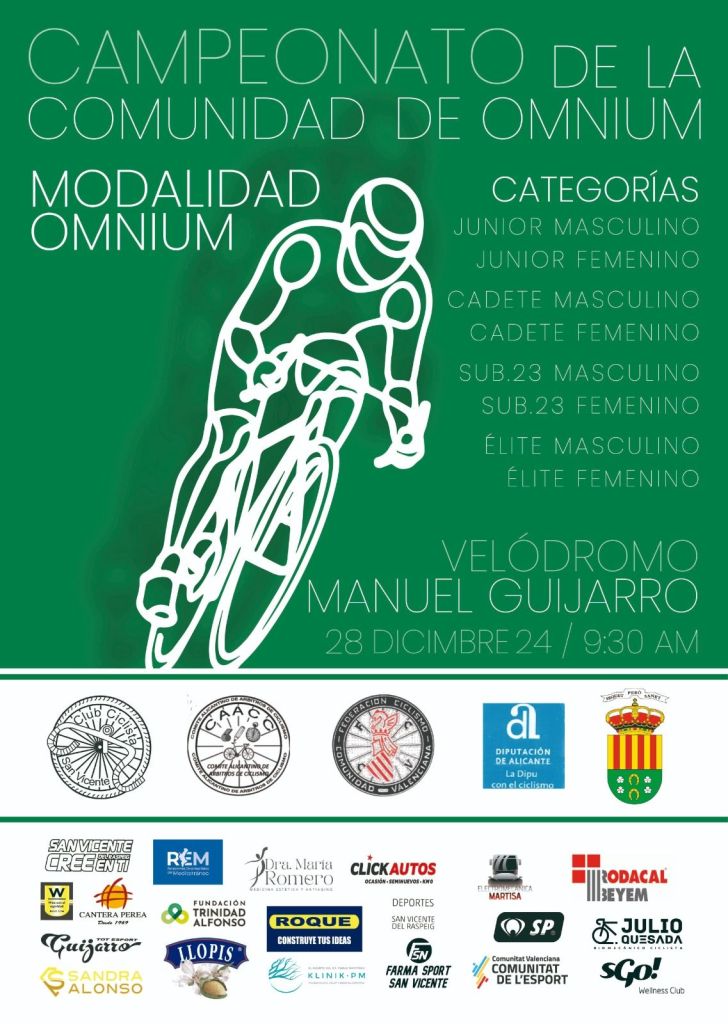 San Vicente del Raspeig acoge el sábado, 28 de diciembre, en el Velódromo Manuel Guijarro, el Autonómico de Ómnium. El exitoso formato de regularidad estará compuesto por las 4 pruebas de Scratch, Tempo, Eliminación y Puntuación. Desde las 9:30h. Lucharán por los títulos todas las categorías, incluidas las de Escuelas (Alevín e Infantil).