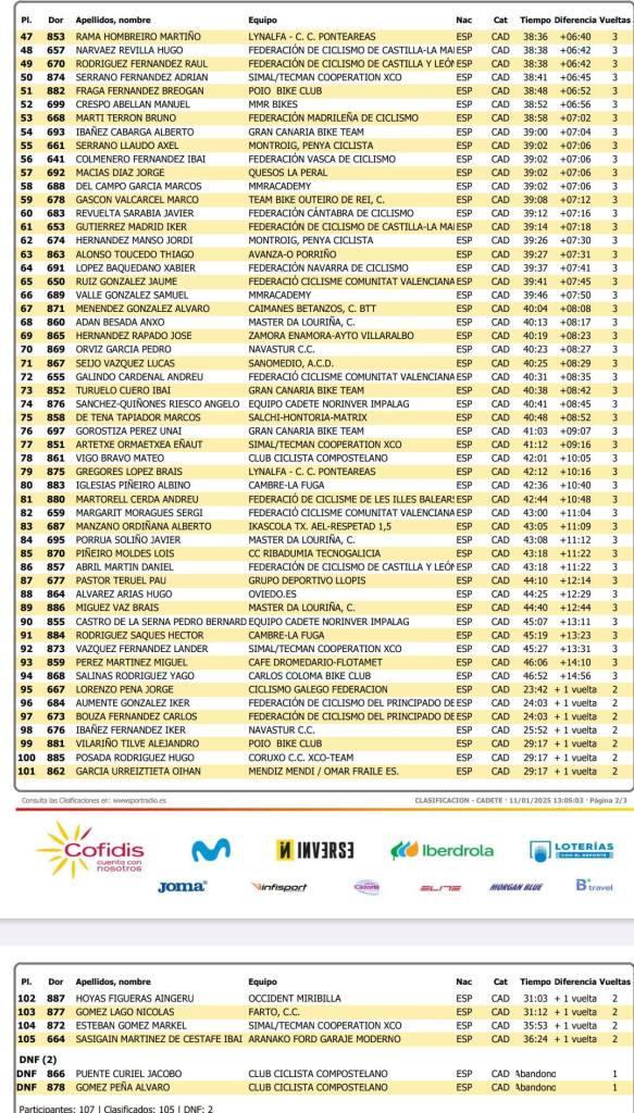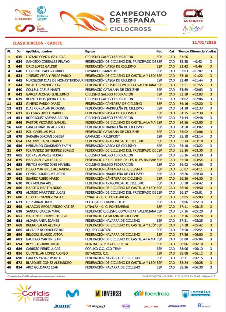 Lucas Lozano (Galicia) se ha proclamado campeón de España cadete de ciclocross. Pelayo Gancedo (Asturias) ha terminado segundo y Galder Orio (Euskadi), tercero. Séptima plaza de Xavi Vidal. Sus compañeros de Selección: Marc Sancho (34), Jaume Ruiz (65), Andreu Galindo (72) y Sergi Margarit (82). Alberto Manzano (Ikascola) ha terminado en el puesto 83 y Pau Pastor (GD Llopis), en el 87.