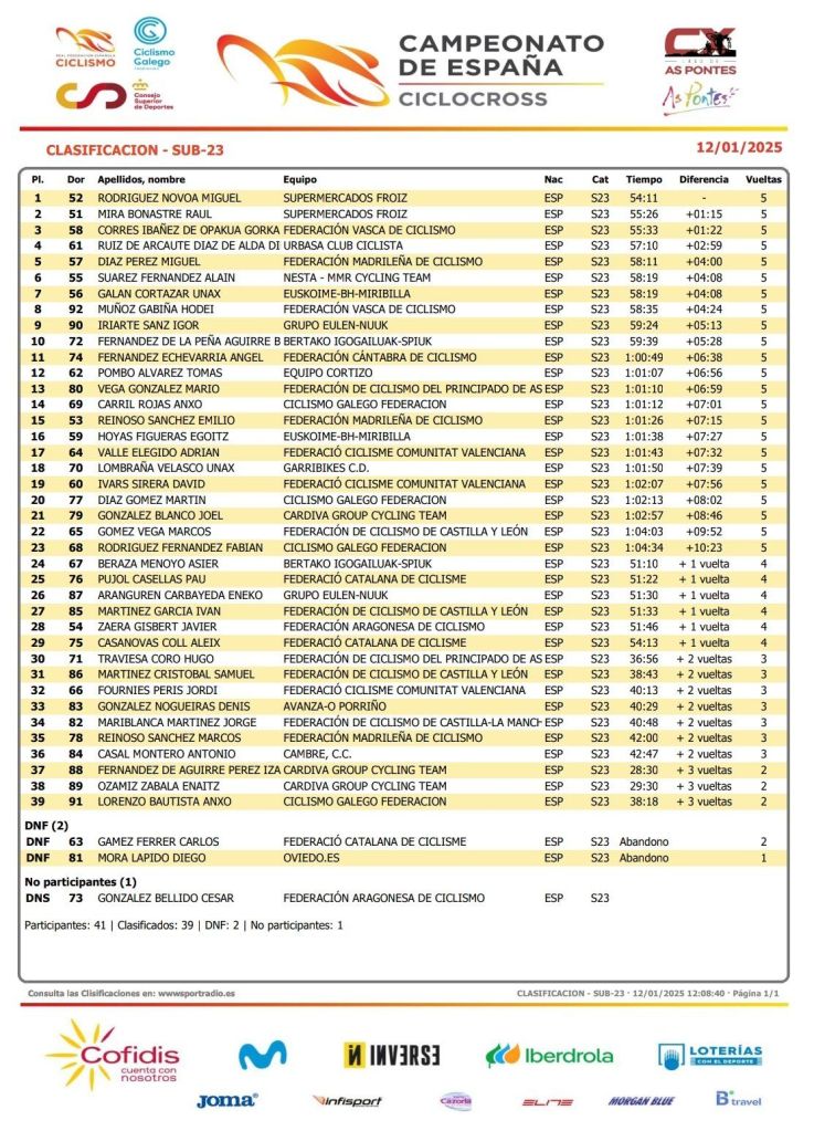 Miguel Rodríguez (Froiz) se ha proclamado campeón de España Sub 23 de Ciclocross. El alicantino Raúl Mira (Froiz) ha terminado segundo y Gorka Corres (Euskadi) ha completado el podio. Puesto 17 para Adrián Valle (FCCV); 19, de David Ivars (FCCV); y 32, para Jordi Fournies (FCCV). Miguel Rodríguez, que venía completando una temporada sensacional, ha confirmado su gran momento de forma consiguiendo alzarse con el maillot de campeón de España por delante del defensor del título, Raúl Mira. Rodríguez, que había sido 3º en 2022 y 2º en 2023, ha logrado hoy cerrar su ciclo como sub23 con la victoria en la gran cita de la temporada, donde ha mandado desde el giro inicial. Raúl Mira ha ocupado la segunda posición a 1’15” tras superar al vasco Gorka Corres en el último giro, que ha concluido tercero a 1’22”.