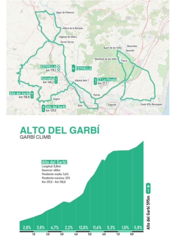 Un exigente recorrido de poco más de 178 kilómetros pondrá a prueba a los ciclistas, con dos ascensos al Alto del Garbí, uno de los puertos más emblemáticos de la comarca del Camp de Morvedre. Con casi 9 kilómetros de subida y una pendiente máxima del 22%, será un reto determinante en el desarrollo de la carrera.