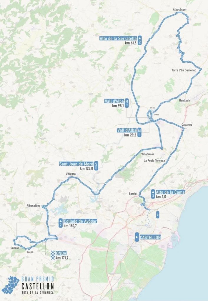 El recorrido de la prueba, que arrancará el sábado 25 de enero a las 12.30 horas desde el Paseo Ribalta de Castellón, discurrirá a través de los municipios y los núcleos cerámicos más representativos de Castellón. En el kilómetro 3 se ascenderá al Alto de la Coma, puerto de tercera categoría que será puntuable para el premio de la montaña. El segundo alto puntuable se situará en el Alto de la Serratella, en el kilómetro 61,5, mientras que el tercer alto puntuable será el Collado de Ayódar, de segunda categoría, a tan solo 11 kilómetros de la meta, en un momento decisivo de la carrera.