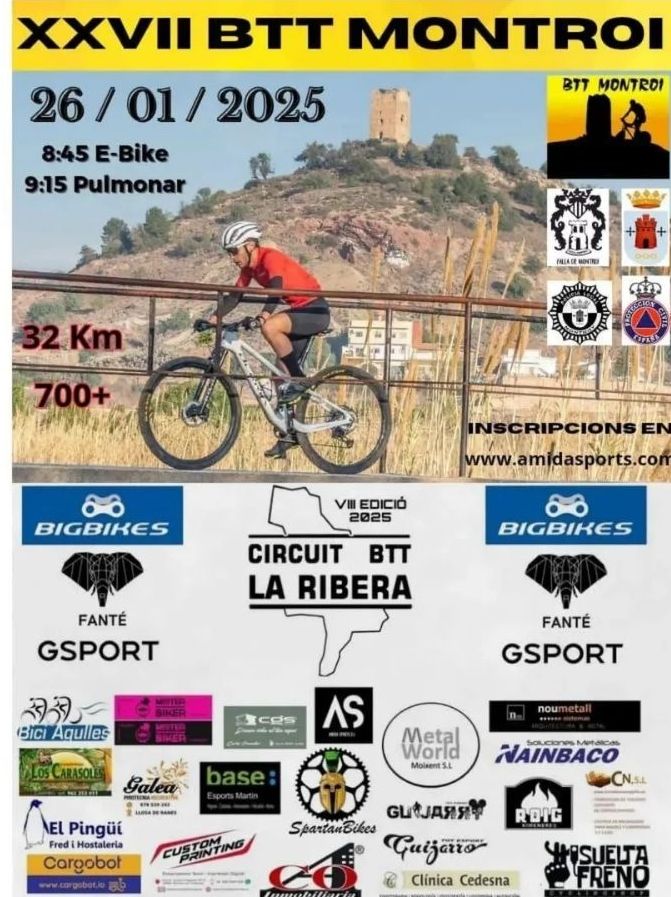 La XXVII Marcha BTT Montroi dará el domingo, 26 de enero, el banderazo de salida a la octava edición del Circuit BTT La Ribera que en 2025 contará con siete pruebas puntuables. Tras la citada de Montroi habrá paradas en Llombai, Alginet, Moixent, L’Alcúdia, Navalón y Llosa de Ranes.