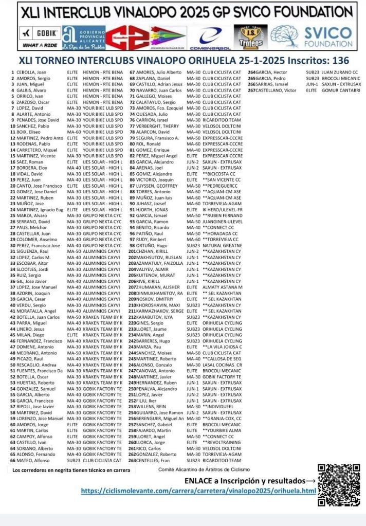 Destacar dentro de las incripciones la presencia de los corredores del Orihuela Cycling Team Sergio Ginés, Ángel Martín, Hugo Barreres y Jaume Lloret, que debutarán con su nueva indumentaria en casa.
