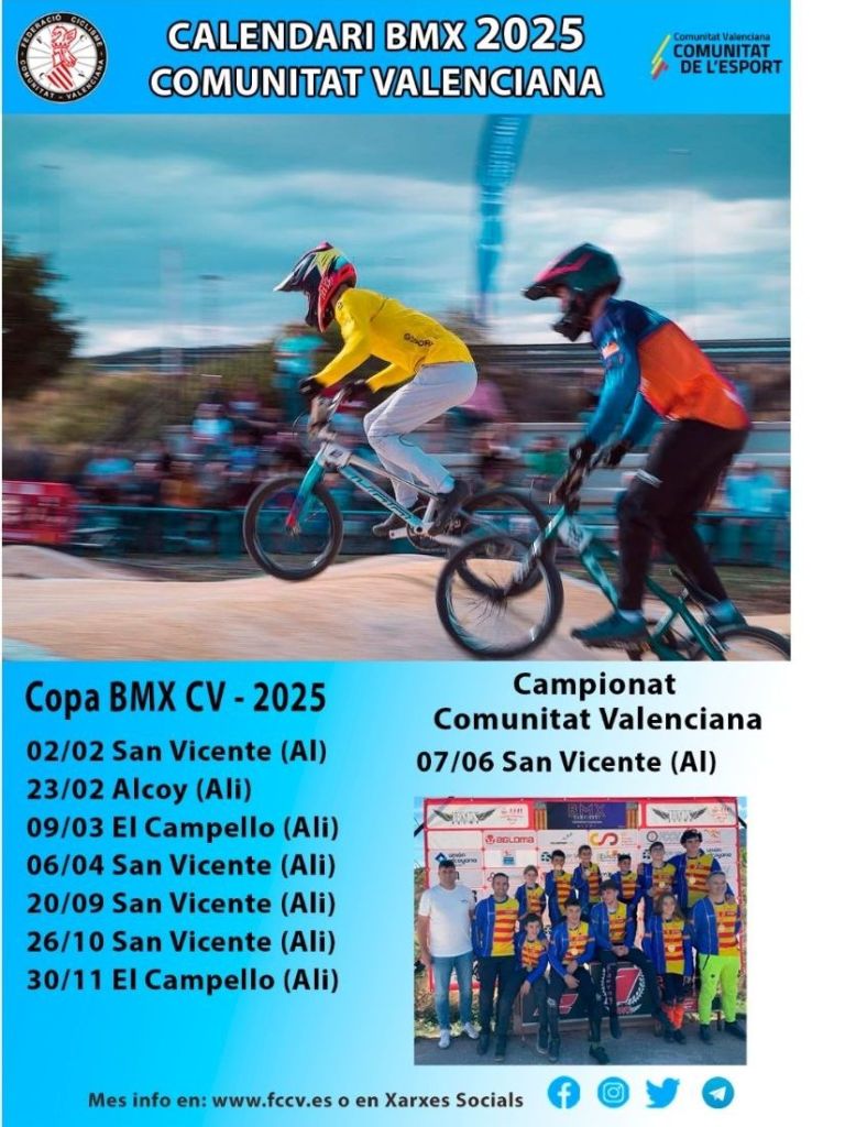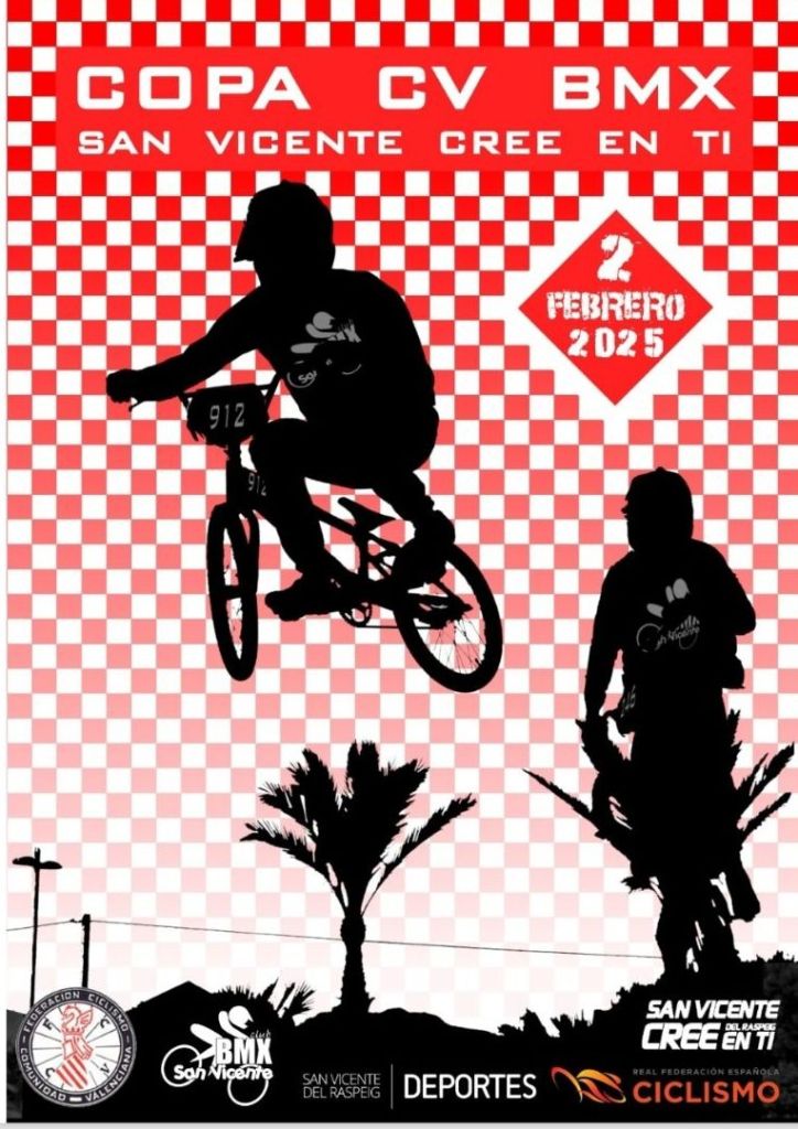 San Vicente del Raspeig dará el pistoletazo de salida, el próximo 2 de febrero, a la Copa BMX Comunitat Valenciana 2025. La competición cuenta con otras seis pruebas puntuables en Alcoy (23/02), El Campello (9/03), San Vicente (6/04), San Vicente (20/09), San Vicente (26/10) y El Campello (30/11).