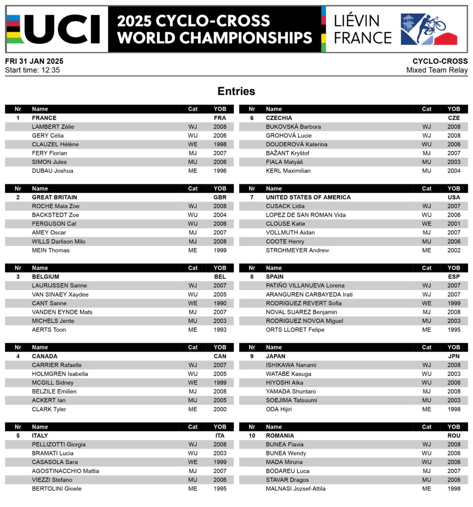La selección española estará presente en la prueba de Team Relay del campeonato del Mundo de ciclocross, que se disputará durante el próximo fin de semana en Liévin (Francia), y que tendrá su primera cita competitiva el mismo viernes 31 de enero.