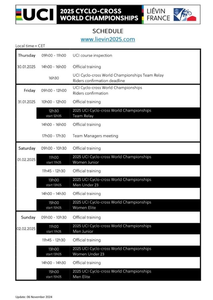 El viernes 31 de enero se disputará el Team Relay a las 12:30 horas. El sábado tendrá lugar la prueba júnior femenina (11:00 h.), la carrera sub23 masculina (13:00 h.) y la cita élite femenina (15:00 h.). Ya el domingo la jornada arrancará con la carrera júnior masculina (11:00 h.), seguida de la prueba sub23 femenina (13:00 h.) y se cerrará con el evento élite masculino a las 15:00 h.