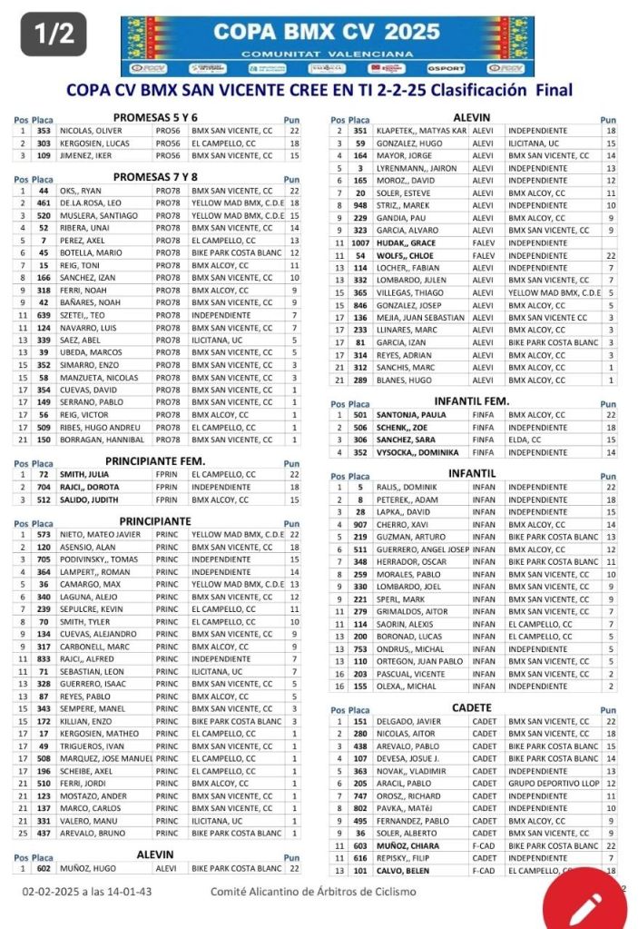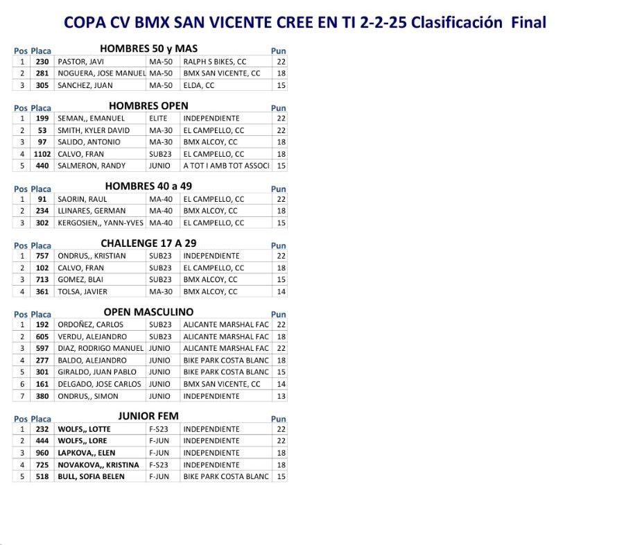 San Vicente ha abierto hoy la primera prueba puntuable de la Copa BMX Comunitat Valenciana 2025. Oliver Nicolás (BMX San Vicente) se ha impuesto en Promesas 5 y 6; Ryan Oks (BMX San Vicente) lo ha hecho en Promesas 7 y 8; Julia Smith (El Campello) y Mateo Javier Nieto (Yellow), en Principiantes; Hugo Muñoz (Bike Park Costa Blanca), en Alevines; Paula Santonja (BMX Alcoy) y Dominik Ralis, en Infantiles; Javier Delgado (BMX San Vicente) y Chiara Muñoz (Bike Park), en Cadetes; Javi Pastor (Ralphs Bikes), en Hombres 50 y Más; Emanuel Seman, en Hombres Open; Raúl Saorín (El Campello), en Hombres 40 a 49; Kristian Ondrus, en Challange 17 a 29; Carlos Ordóñez (Alicante), e Open Masculino; y Lotte Wolfs, en Júnior Femenino.
