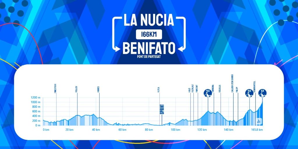 Un día más tarde, el jueves 6, los corredores se enfrentarán a un exigente trazado de 166 kilómetros que comenzará en La Nucía y concluirá en el inédito Alt de Partegat, en Benifato. Una dura jornada, ideal para las escapadas, con otros dos puertos de montaña: Coll de Rates y l’Alt de Benimantell.