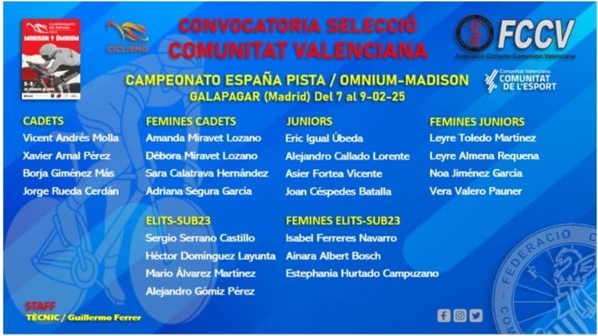 La Federació de Ciclisme de la Comunitat Valenciana ha hecho pública la convocatoria de los ciclistas que formarán la Selección de la Comunidad en el Campeonato de España Pista, de las modalidades de Madison y Ómnium, que tendrá lugar los días 8 y 9 de febrero en la localidad madrileña de Galapagar.