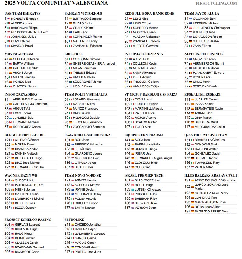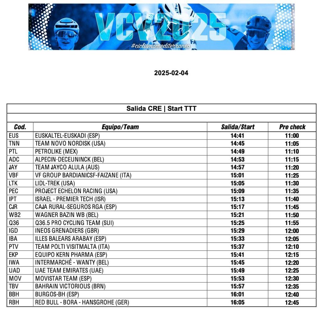 La VCV 2025 – Volta a la Comunitat Valenciana Gran Premi Banc Sabadell inaugura la temporada de grandes vueltas por etapas en el calendario ciclista internacional. La ronda valenciana arranca este miércoles 9 de febrero desde Orihuela, y lo hace con una contrarreloj por equipos que enfrentará a algunas de las mejores escuadras del mundo en esta especialidad. Etapa que marcará el devenir futuro de una carrera en la que el norteamericano Brandon McNulty defiende la victoria conseguida hace ahora un año en la 75VCV. Los españoles Carlos Rodríguez y Pello Bilbao son dos de los aspirantes a arrebatarle la victoria a McNulty, al igual que el colombiano Santiago Buitrago y el ruso Aleksandr Vlasov (segundo y tercero de la general hace un año). Al margen de la victoria final, el duelo de sprinters entre Jonathan Milan y Kaden Groves es otro de los grandes atractivos de la ronda valenciana. Gonzalo Ariño, Joan Bou y Jaume Guardeño tratarán ser profetas en su tierra.