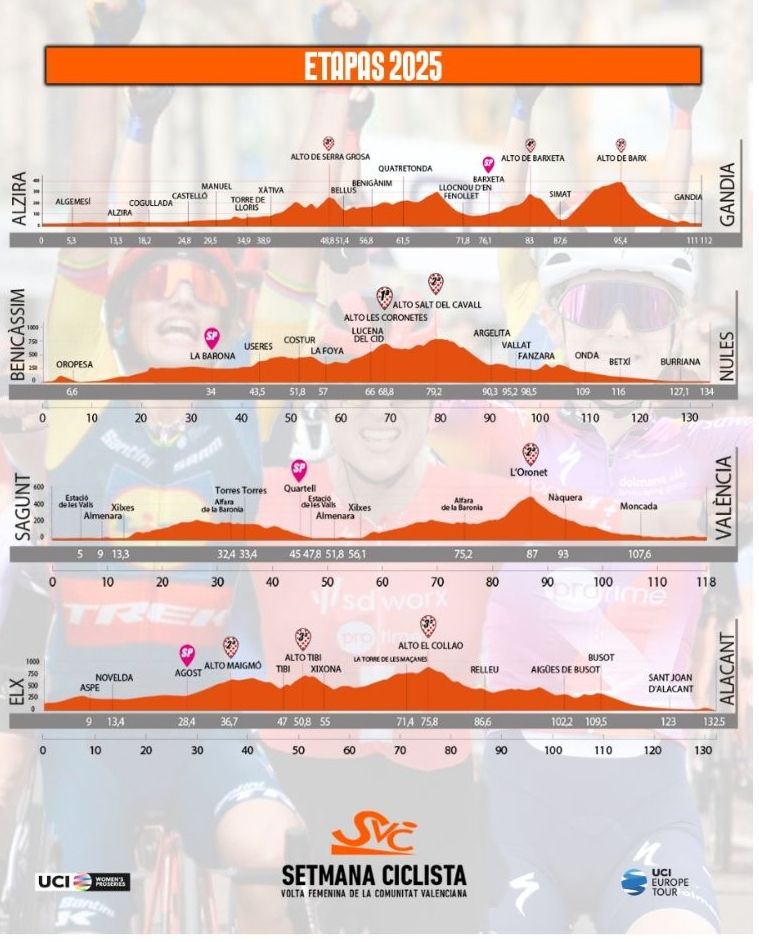 La 9ª edición de la Setmana Ciclista – Volta Femenina de la Comunitat Valenciana ha dado a conocer todos los detalles de la edición 2025. La carrera, que se celebrará del 13 al 16 de febrero, volverá a tener de protagonistas a las mejores ciclistas del mundo para regalar al espectador 4 días de ciclismo de alto nivel alrededor de las tres provincias de la Comunitat Valenciana.
