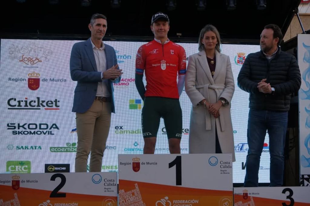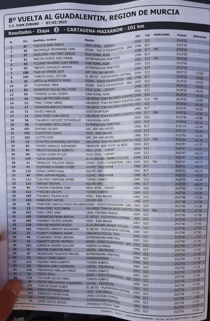 Pablo Ortega (High Level-Gsport) es el primer líder de la Vuelta Ciclista al Guadalentín tras imponerse en la primera etapa que ha llevado al pelotón de Cartagena a Mazarrón, tras 116 kilómetros de recorrido. Iván Palomeque (Essax Svico Foundation) ha sido segundo y Sergio Geerlings (Filial Caja Rural), tercero.