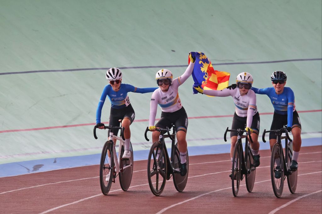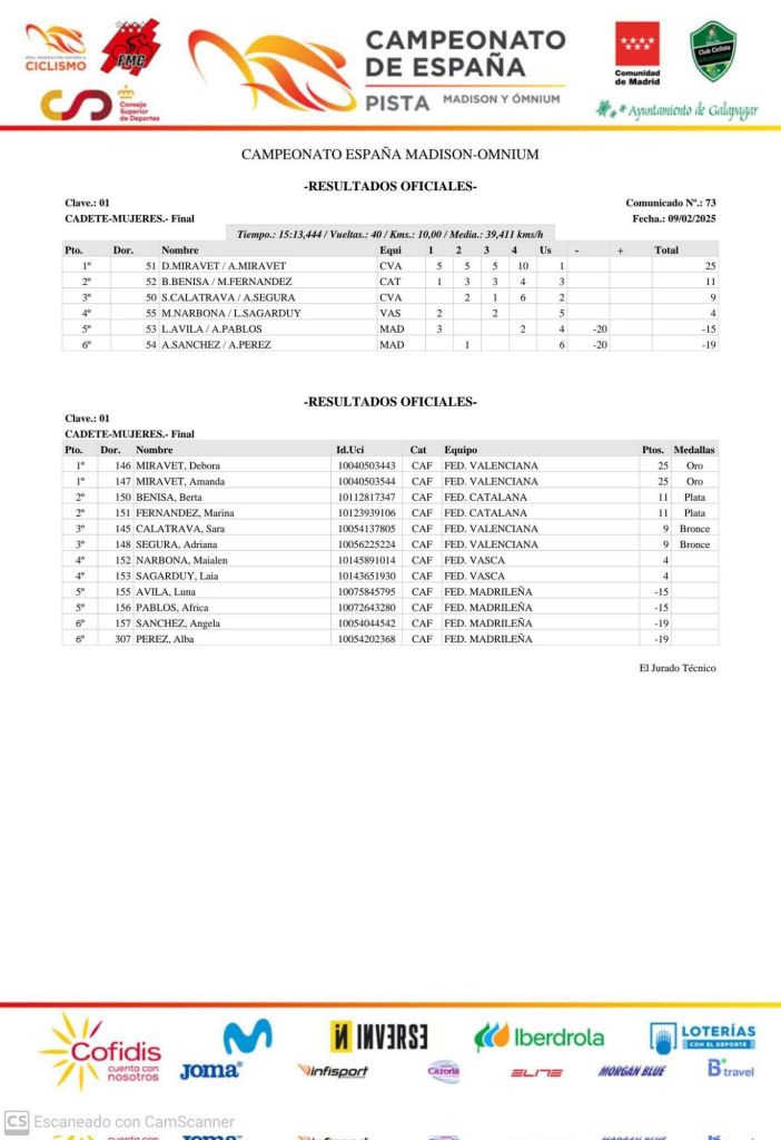 Amanda y Débora Miravet se han proclamado esta mañana campeonas de España en MADISON cadete de féminas. Además, Sara Calatrava y Adriana Segura han logrado la tercera posición en el velódromo de Galapagar. Las hermanas Amanda y Debora Miravet han dominado con autoridad durante toda la prueba para terminar sumando 25 puntos y hacerse con el campeonato de España de su categoría. La segunda posición la han ocupado las catalanas Berta Benisa y Marina Fernández, con 11 puntos, mientras que al tercer peldaño del podio se han subido las también valencianas Sara Calatrava y Adriana Segura, tras acumular 9 puntos.