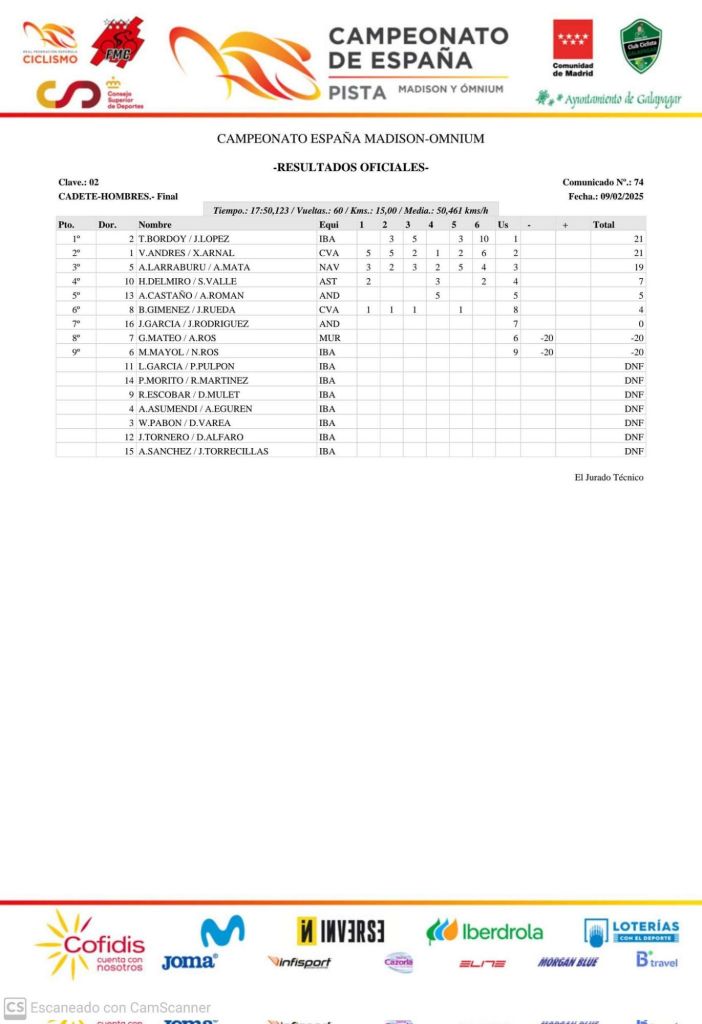 La dupla balear compuesta por Toni Bordoy y José Luis López se ha llevado el título cadete tras ganar el último sprint y alcanzar los 21 puntos, misma puntuación que la conseguida por los valencianos Vicent Andrés y Xavier Arnal, que sufrieron una caída en el tramo final de la prueba y quedaron lastrados por dicha circunstancia. Ambas parejas han protagonizado una preciosa pugna por la victoria en la que también ha estado involucrada el dúo navarro, formado por Ander Larraburu y Aitor Mata, que ha concluido en tercera posición con 19 puntos.