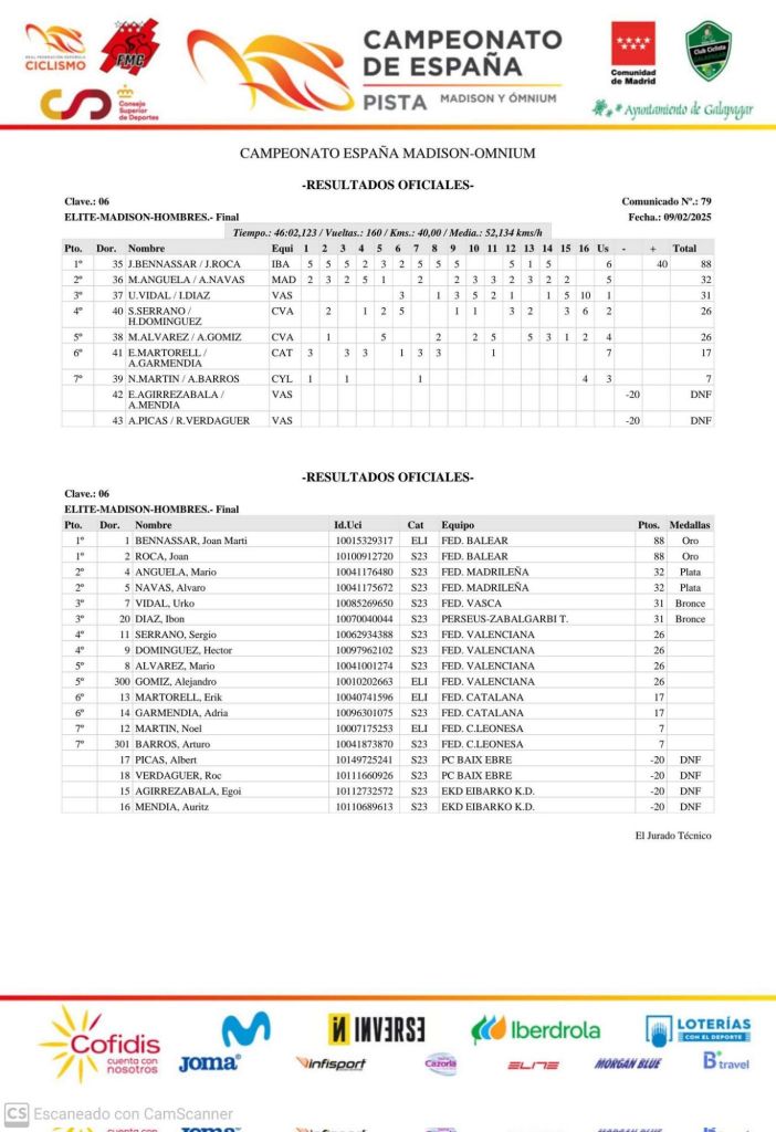 Roca y Bennassar han demostrado ser desde las primeras vueltas la pareja más fuerte y prácticamente en todo momento han estado en primera posición. En el ecuador de la Madison han roto definitivamente la prueba gracias a un poderoso ataque en solitario que le has permitido coger vuelta y afrontar el tramo final con la posibilidad de ir controlando a sus adversarios para sellar la victoria en el nacional. Aún así, han decidido dejar sobre la pista todo lo que tenían y para deleite del público han logrado sumar una vuelta más. Finalmente, Roca y Bennassar, que ya ganó esta misma prueba el pasado año con su hermano Francesc, han concluido en primera plaza con 88 puntos por los 32 de la segunda pareja clasificada, que han sido los madrileños Álvaro Navas y Mario Anguela. El tercer puesto ha estado muy disputado, pero tras ganar el último sprint los vascos Urko Vidal e Ibón Díaz han logrado colgarse el bronce con 31 puntos y dejar en cuarta posición a los valencianos Sergio Serrano y Héctor Domínguez. Quinta plaza para Mario Álvarez y Alejandro Gómiz.
