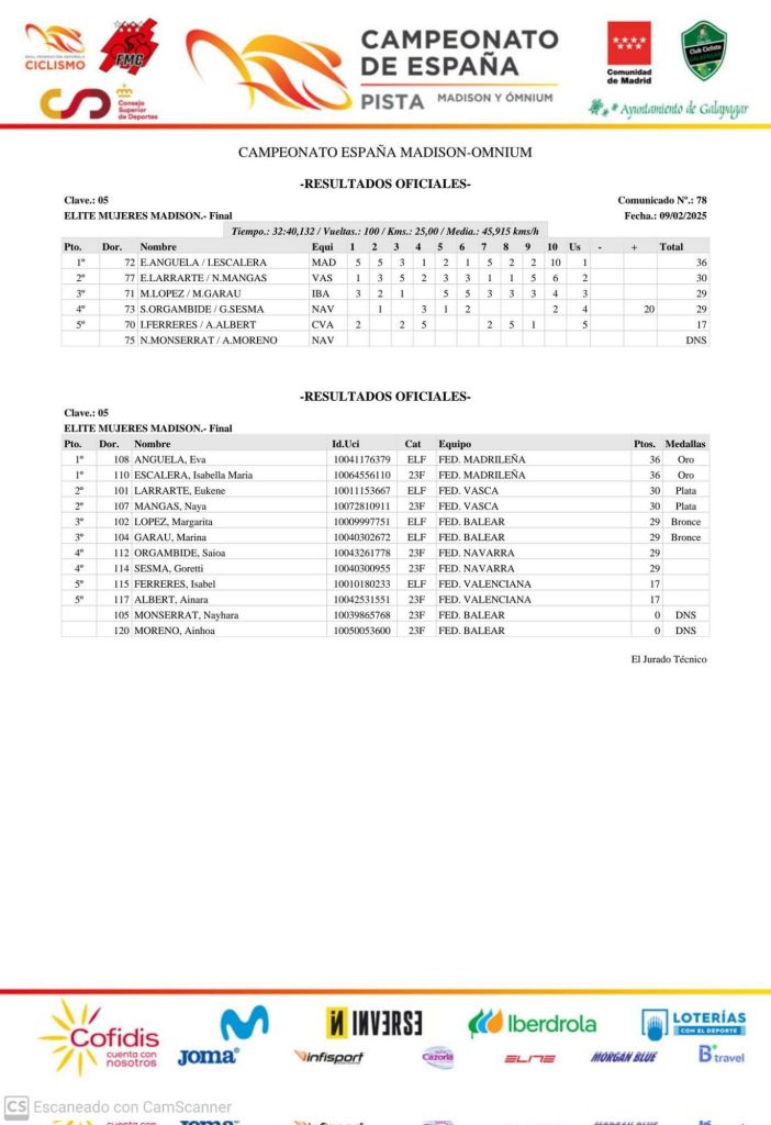 La Madison que ha gozado de mayor emoción en su resolución ha sido, sin duda, la élite femenina. La vuelta ganada por la pareja formada por Saioa Orgambide y Goretti Sesma en el tramo final de la competición ha dado un completo vuelco a la general situando a las navarras en primera posición a falta del último sprint. A un punto se encontraban Anguela y Escalera, que habían sido hasta entonces las más fuertes en los sprints; a dos estaban Marga López y Marina Garau y a tres la dupla vasca integrada por Naya Mangas y Eukene Larrarte. La victoria y cada una de las posiciones del podio estaba por resolver a falta del toque de campana final, donde una poderosa arrancada de Eva Anguela, haciendo valer su demoledora velocidad punta, ha terminado inclinando la competición en favor de Madrid. Finalmente, Anguela y Escalera han ganado con 36 puntos.