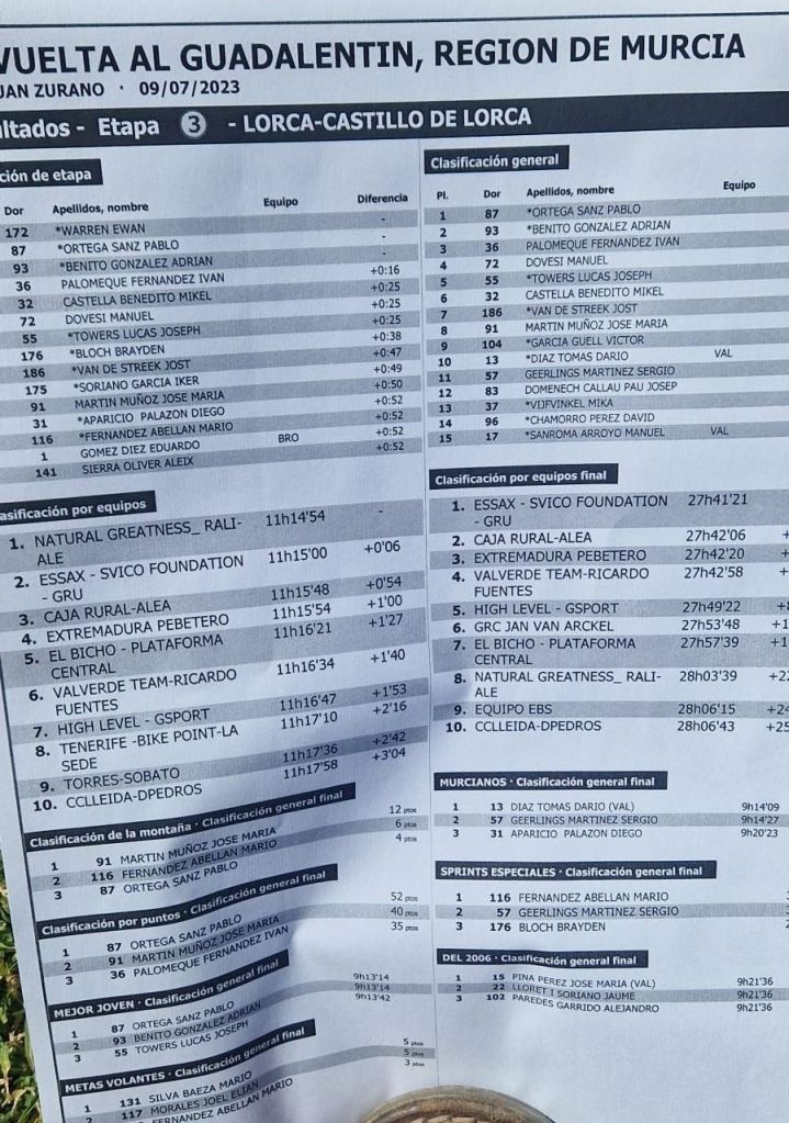 Ewan Warren (Natural Greatness Rali Alé) se ha impuesto en el Castillo de Lorca en la última etapa de la Vuelta al Guadalentín. Ha entrado en meta por delante de Pablo Ortega (High Level-Gsport) y Adrián Benito. Cuarta plaza, a 16 segundos, para Iván Palomeque (Essax Svico Foundation).