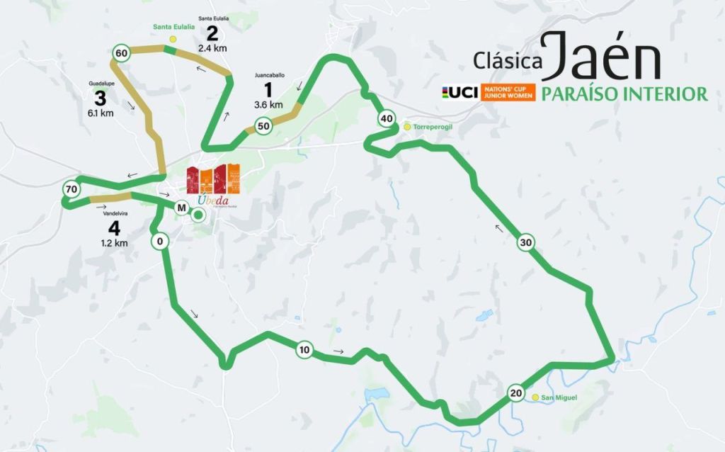 La exigente carrera por tierras jienenses, que se estrena también en Copa de las Naciones, comprenderá un recorrido de 84,5 kilómetros y 1100 metros de desnivel positivo acumulado en el que las ciclistas se encontrarán hasta cuatro tramos de ‘sterrato’. Los tramos de ‘Juancaballo’ (3,7 km), ‘Santa Eulalia’ (2,5 km); ‘Guadalupe’ (6,2 km); y ‘Vandelvira’ (1,2 km y que concluye a solo dos km de meta) aportarán un extra de dureza a una cita que comenzará y finalizará en la majestuosa localidad de Úbeda.