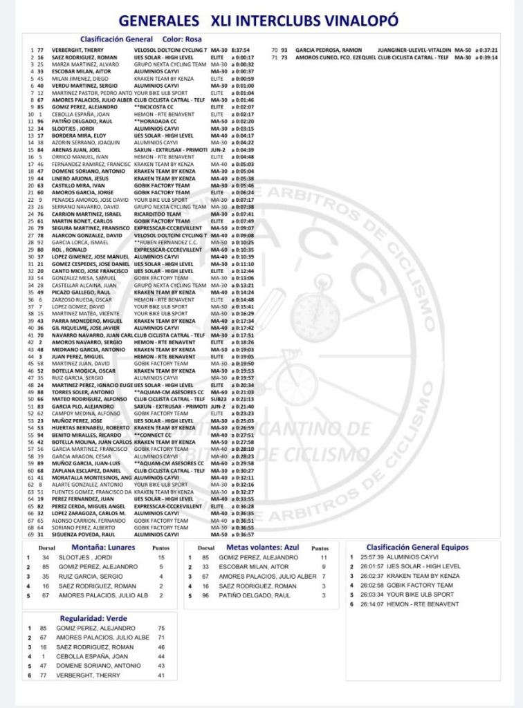 Sáez comanda la clasificación de los Élites; Joel Arenas (Saxun-Extrusax-Primoti), la de los jóvenes; Verberght es el mejor M30; Eloy Bordera (Ijes Solar-High Level) es el mejor M40; Raúl Patiño (Horadada), en M50; y Ronald Rol, en M60. El maillot de la Regularidad y las Metas Volantes está en manos de Gómiz; Jordi Slootjes, las Metas Volantes; y el Aluminios Cayvi domina por conjuntos.