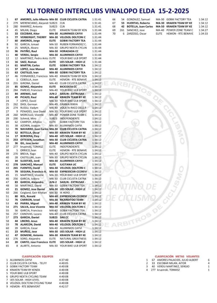 Diego Milán (Kraken Team By Kenza) ha sido el mejor élite; Amores se ha impuesto en M30; José Manuel López (Aluminios CAYVI), en M40; Ismael García (Rubén Fernández), en M50; y Ronald Rol (ExpressCar Crevillent), en M60. Amores se ha adjudicado el premio de las Metas Volantes y el Aluminios Cayvi ha sido la mejor escuadra.