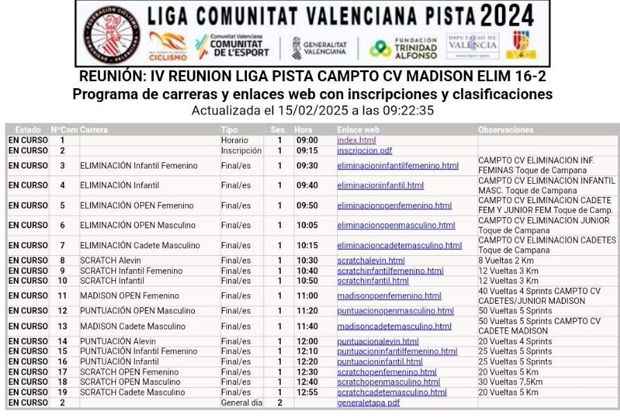 19 – Ontinyent (Autonómico de Scratch y Puntuación (Hombres). Liga Pista FCCV). Clasificaciones