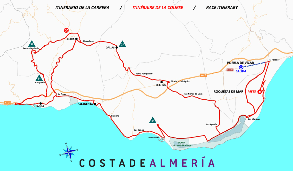Las ascensiones a Dalías, Fuente Marbella y la Alquería servirán para que la fuga del día haga camino, buscando ese último repecho puntuable de Almerimar, donde suele soplar el viento. El nervioso circuito final de Roquetas obligará a pelear la posición y a buscar el mejor momento para lanzar el esprint definitivo y la victoria de la Clásica de Almería.
