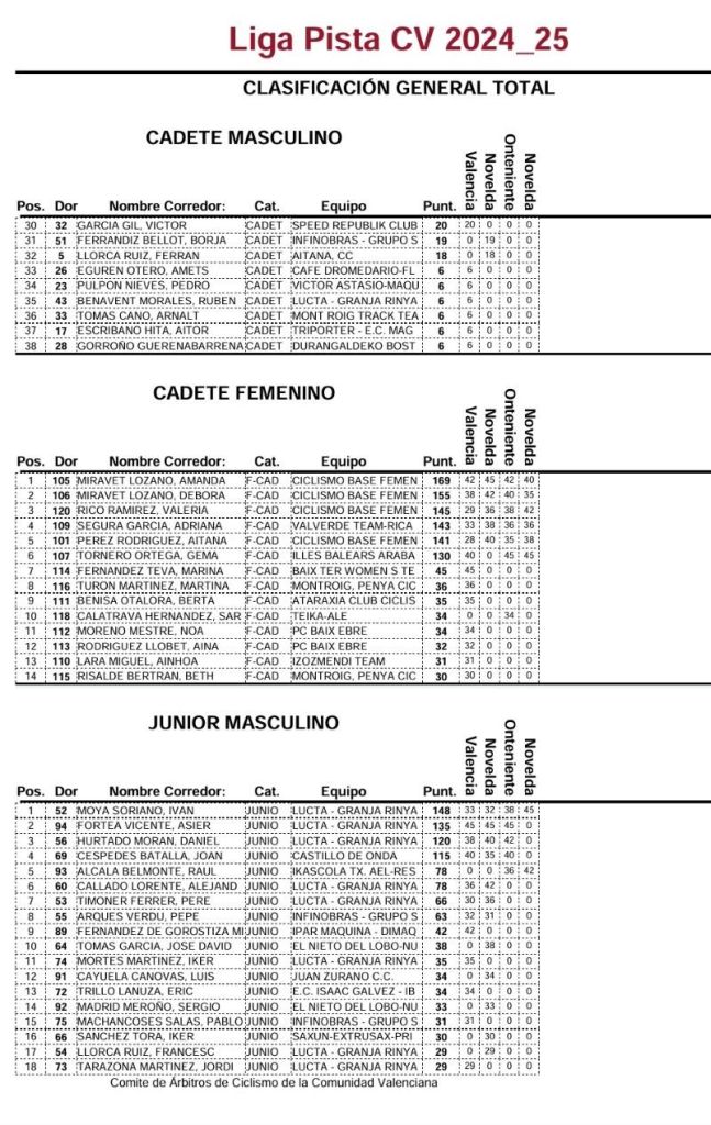 19 – Ontinyent (Autonómico de Scratch y Puntuación (Hombres). Liga Pista FCCV). Clasificaciones