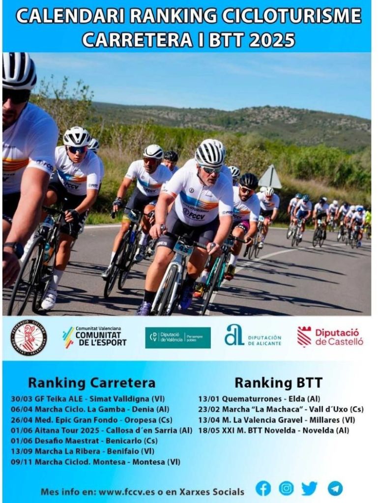 Ya es oficial el calendario Ranking de Cicloturismo de la Federació de Ciclisme de la Comunitat Valenciana que este año incorpora como novedad la puesta en marcha de cuatro pruebas de la modalidad de BTT, impulsado por la Comisión de Cicloturismo del ente federativo. Ambos calendarios establecerán su propio ranking dentro de las marchas programadas en cada modalidad. Cabe recordar que no tiene carácter competitivo. Se seguirán realizando sorteos en todas las marchas del ranking.