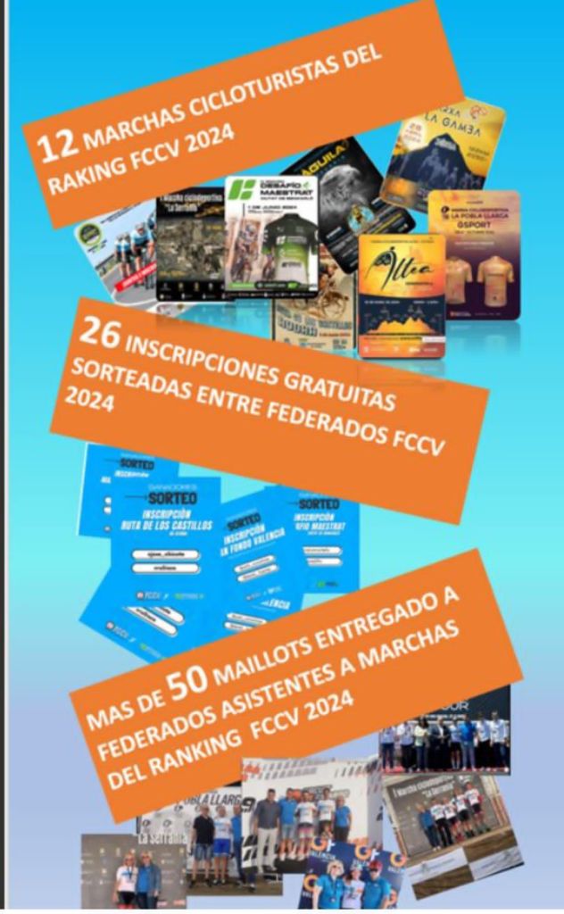 De esta forma, se sigue apostando por el fomento y participación del cicloturismo en la Comunitat Valenciana, tanto en la modalidad de carretera como en la BTT. En 2024 se realizaron doce marchas, se sortearon 26 inscripciones gratuitas entre todos los federados y se entregaron más de 50 maillots a los asistentes a las pruebas.