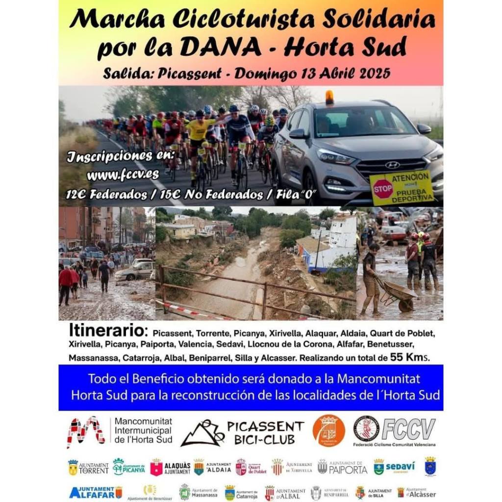 Siguen a buen ritmo las inscripciones solidarias de la Marcha Cicloturista Solidaria por la Dana Horta Sud que se celebrará el próximo domingo 13 de abril. La inscripción esta limitada a 500 participantes y se recomienda no esperar a última hora para lucir su dorsal solidario por los 18 municipios de l’Horta Sud. Todos los beneficios serán donados a la cuenta solidaria de la Mancomunitat Horta Sud.