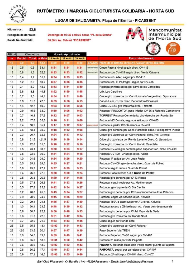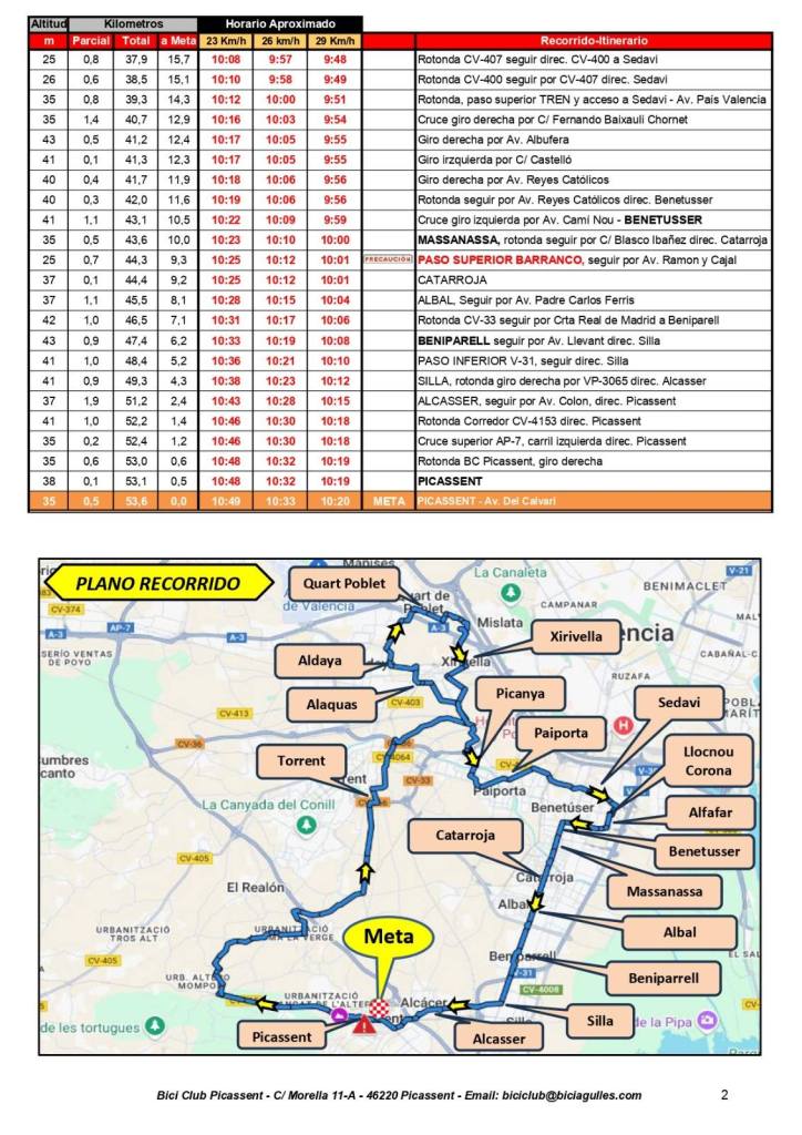 El lugar de salida y llegada será desde Picassent y irá pasando por Torrent, Picanya, Alaquas, Aldaia, Quart de Poblet, Xirivella, Paiporta, Sedavi, Llocnou de la Corona, Alfafar, Benetusser, Massanassa, Catarroja, Albal, Beniparrell, Silla, Alcasser, y de nuevo Picassent. Serán 56,3 kilómetros.