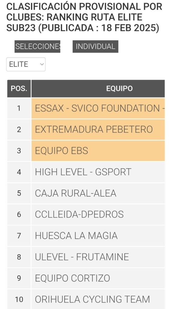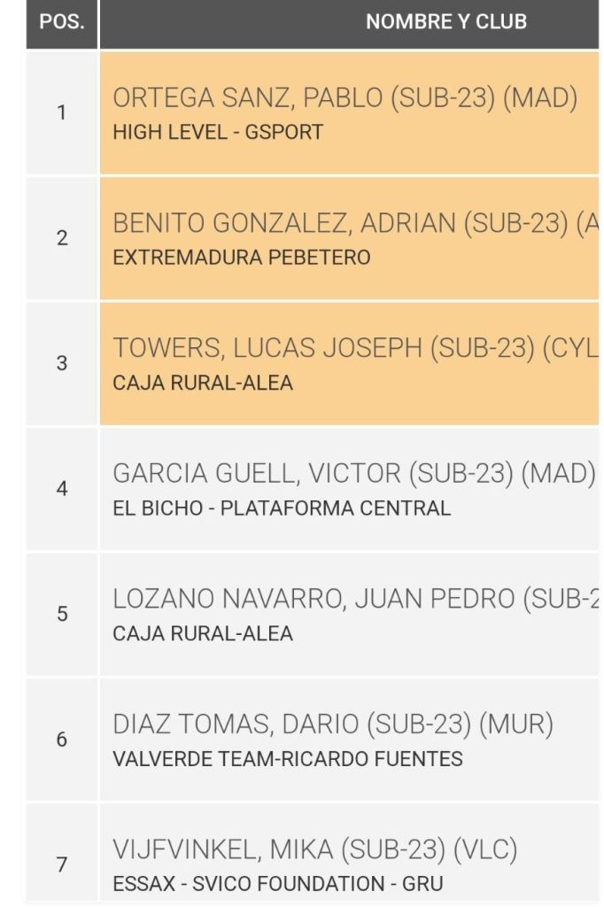 Iván Palomeque (Essax Svico Foundation) y Pablo Ortega (High Level Gsport) lideran el Ranking de la RFEC de Ruta en las categorías Élite y Sub 23, respectivamente. Ambos ciclistas tienen en común que tras un año aciago por lesiones y enfermedades han logrado estar ahí con los mejores en este inicio de campaña. Palomeque subió al podio de la general de la Vuelta al Guadalentín. «No le doy mucha importancia ahora mismo. Lo importante es que he empezado bien el año y me quedo con eso, después de varios años malos con lesiones y demás», apunta el benidormense. Clasificación