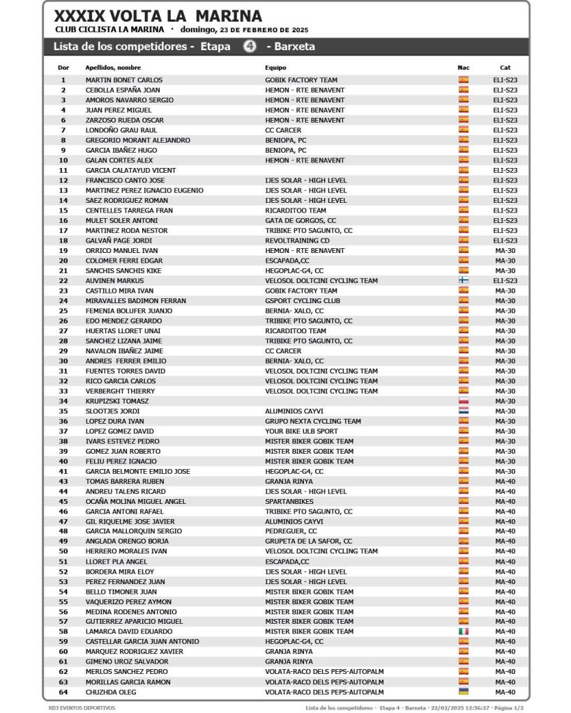 En la General, Joan Cebolla llega de líder. El maillot de la Montaña lo llevará Miguel Juan Pérez (Hemón Restaurante Benavent) y el de las Metas Volantes Markus Auvinen (Velosol). Ferrán Miralles manda en M30; Eloy Bordera, en M40; Germán Mortes, en M50; y Eliseo Boix, en M60