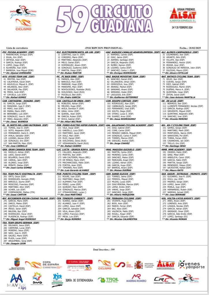 Alejandro Callado, Iker Mortes, Mauro Van Cauteren, Mario de Mingo, Pablo Machancoses, Asier Fortea y Pere Timoner, con el Lucta-Granja Rinya que dirigirá Luis Gerardo Álvarez. El Picusa Academy pondrá en liza a Asier Ortega, Kike Maranchón y Eric Igual, Además de a José Salgueiro, Adrián Prieto, Diego López y Xian Alvariño. Luis Bernabéu competirá con el CC La Palma de Jesús Buendía. El Ayuso Team estará también en la cita extremeña al igual que el Castillo de Onda con Adrián Robledo, Hugo Meler, Víctor Grau, Asier Queral, Rubén García, Denilson Dávila Fabián y Gabriel Roca. Hilari Beltrán es el director. Por su parte, Xavi Mestre, Aitor Arlandis, David Calatrava, Pau Salvador, Miguel Ángel Aguilella, Luis Cayuela y Jordi Peris defenderán el maillot del Ayuso.