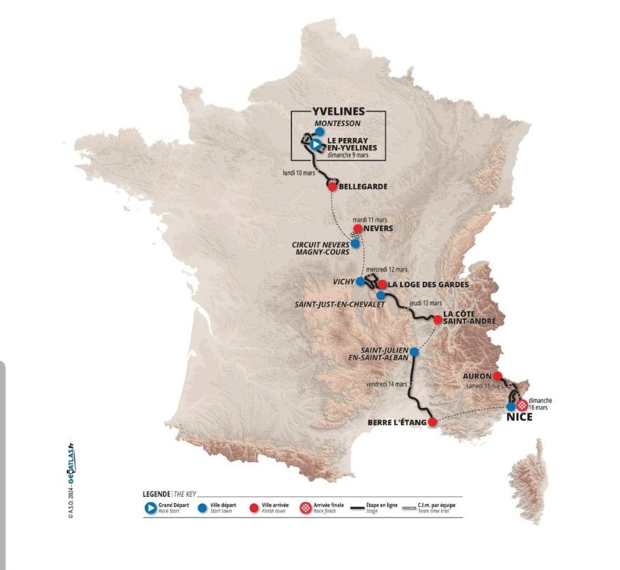 Tal y como acostumbra, la carrera francesa presenta un trazado con diferentes tipos de exigencia, en el que la montaña se va introduciendo de forma progresiva a lo largo de sus ocho etapas. Tras dos primeras jornadas nerviosas, propensas a una llegada en grupo, la crono por equipos del tercer día (28 km entre el circuito de Magny-Cours y Nevers) marcará las primeras diferencias importantes. La montaña llegará al día siguiente con la subida a la Loge des Gardes, el primero de sus dos finales en alto, precediendo una etapa plagada de pequeñas cotas en su desenlace y otro perfil en teoría más sencillo hasta Berre l’Étang. Como siempre, todo se resolverá en un fin de semana final apasionante que arrancará con la llegada en alto a Auron previo paso por La Colmiane y que cierra su tradicional etapa final por los alrededores de la Costa Azul con llegada al Paseo de los Ingleses de Niza tras ascender la Côte de Peille, el Col d’Èze y el Col de Quatre Chemins.