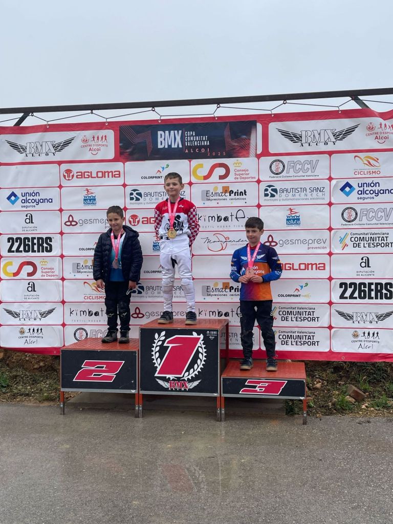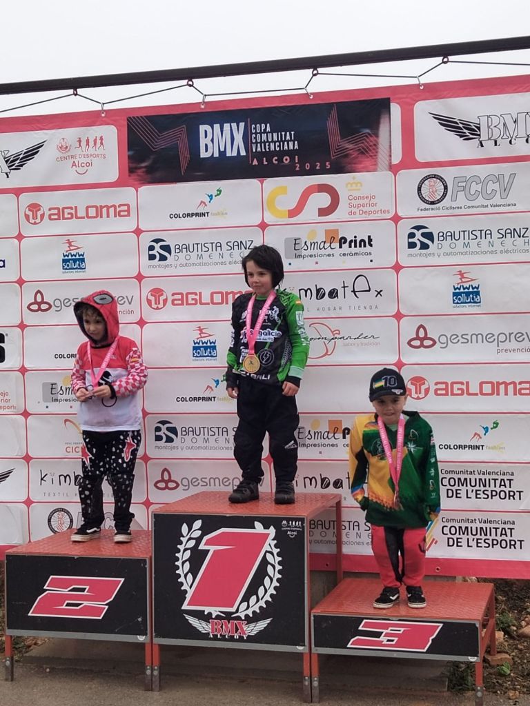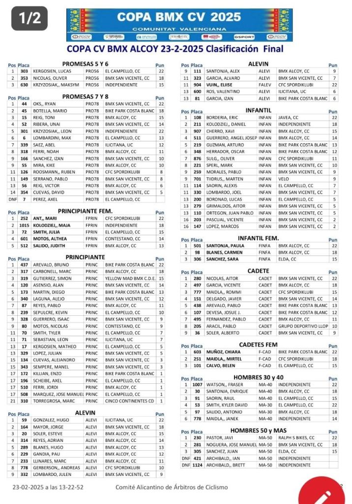 Alcoy ha acogido hoy la segunda jornada de la Copa BMX de la Comunidad Valenciana. Lucas Kergosien (El Campello) se ha impuesto en Promesas 5 y 6; Ryan Oks (San Vicente), en Promesas 7 y 8; Mari Ant (Sportdiklubi) y Bruno Arévalo (Bike Park Costa Blanca), en Principiantes; Hugo González (UC Ilicitana), en Alevines; Eric Bordera (Jávea) y Paula Santonja (BMX Alcoy), en Infantiles; Aitor Nicolás (San Vicente) y Chiara Muñoz (Bike Park Costa Blanca), en Cadetes; Fraser Watson, en Hombres 30 y 40; Javi Pastor (Ralph’s Bike), en Hombres 50 y más; Fran Calvo (El Campello) en Challeng 17 y más; Carlos Ordóñez (Alicante Marshal), en Open Masculino;y Rodrigo Manuel Díaz (Alicante) y Sofía Belén Bull (Bike Park Costa Blanca), en Júniors