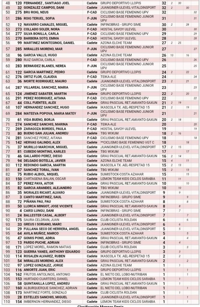 En la categoría femenina, el Hostal Savoy Ulevel ha estrenado su palmarés con el triunfo de Nayara Ibáñez. Amanda Miravet (Ciclismo Base UPV) ha terminado segundo; e Irene Flores (Hostal Savoy Ulevel) ha completado el podio. Nayara Ibáñez también ha ganado las Metas Volantes.
