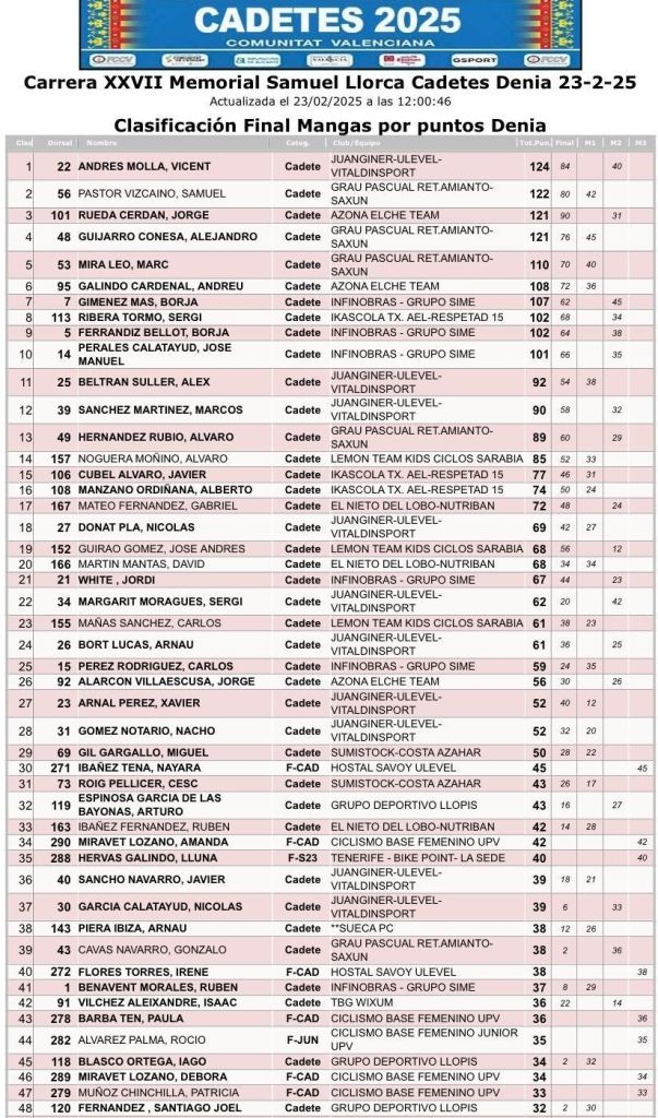 Vicent Andrés (Juanginer-Ulevel Vitaldinsport) se ha impuesto esta mañana en Dénia en el XXVII Memorial Samuel Llorca de Cadetes. Samuel Pastor (Grau Pascual-Saxun) ha sido segundo y Jorge Rueda (Zona Elche Team), tercero.