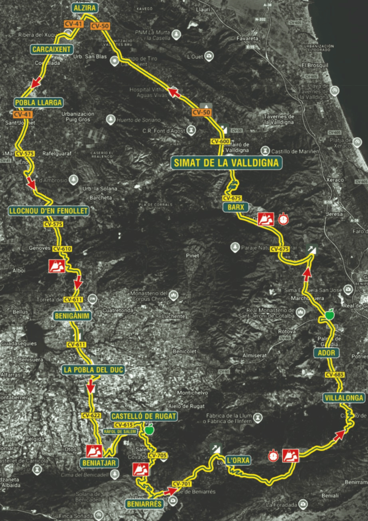El recorrido es de 130 kilómetros con algo más de 1800 m+ de desnivel repartidos en 5 puertos: Benigànim, Beniatjar, Beniarrés, L’Orxa y La Drova. Los dos últimos serán tramos cronometrados. La salida y llegada estarán situadas en la localidad de Simat de la Valldigna.