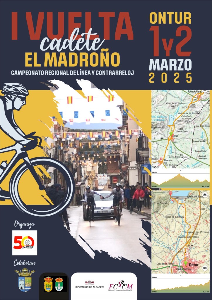 Este fin de semana, los días 1 y 2 de marzo, se disputa en Ontur la I Vuelta Ciclista «El Madroño» para ciclista Cadetes. Dicha carrera tambien congregará los Campeonatos Regionales de Ciclismo Castellano Manchegos de Linea y Contrarreloj. Tomarán la salida 200 corredores, distribuidos en 22 equipos, entre los que se encuentran Grau Pascual Saxun, A Zona Elche Team, Juan Giner Ulevel Vitaldinsport, Ikascola, Guerola, Torrevieja, Infinobras y GD Llopis. Lista de incristos. El sábado, desde la 15:00 horas, se realizara la presentación de los conjuntos y se hará el control de firmas de los corredores que tomarán la salida desde la esquina de la calle Florida para afrontar la primera etapa en ruta. La segunda jornada tendrá lugar el domingo en la modalidad de contrarreloj.