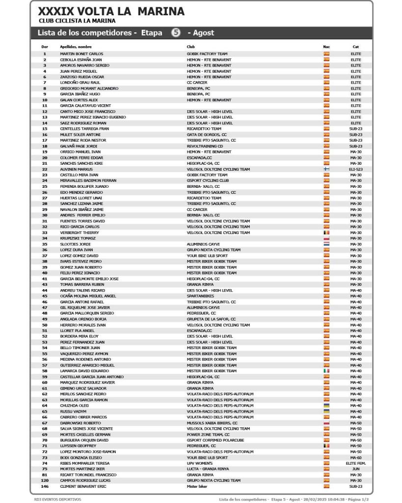 El sábado, día 1 de marzo, se disputa una nueva jornada de la Volta La Marina. Contará con 76,6 kilómetros de recorrido, dos esprints especiales y dos puertos puntuables para el premio de la montaña. La salida se dará a las 10 horas.