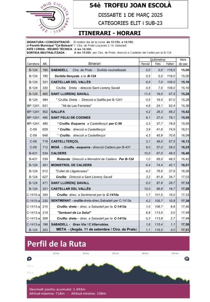 Y el domingo está en juego la 95 edición del Campionat de Sabadell. La salida está fijada a las 9.30 horas. El pelotón recorrerá 140,5 kilómetros.