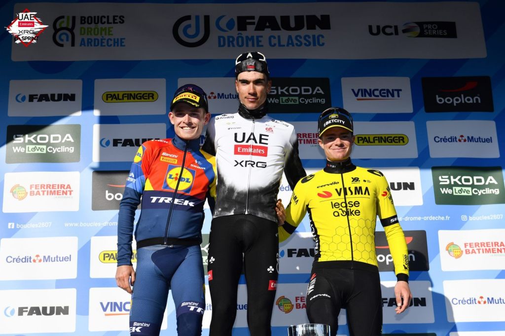 Juan Ayuso ha sido el ganador de la 13ª edición de la Clásica Drôme después de 189 kilómetros. El alicantino ha dado todo un recital al atacar a 40 kilómetros del final para marcharse en solitario logrando mantener una distancia de 30 segundos en todo momento con Mattias Skjelmose. Un triunfo al más puro estilo de Tadej Pogacar. Ayuso propuso una contrarreloj a 40 km de la meta desde que lanzó su intento hasta el desenlace en Étoile-sur-Rhône. Skjelmose y Tulett cerraron el podio en segundo y tercer lugar, respectivamente. Primera victoria en su segunda aparición de la temporada.