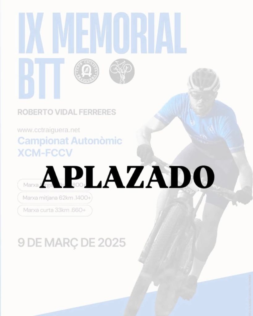 El Club Ciclista Traiguera anuncia que el Autonómico de XCM se disputará el 6 abril. La prueba quedó aplazada a principio de semana «por la alerta meteorológica, prevista para este fin de semana (9 de marzo)». Por este motivo la organización se vio obligada a posponer el Memorial Roberto Vidal Ferreres 2025.