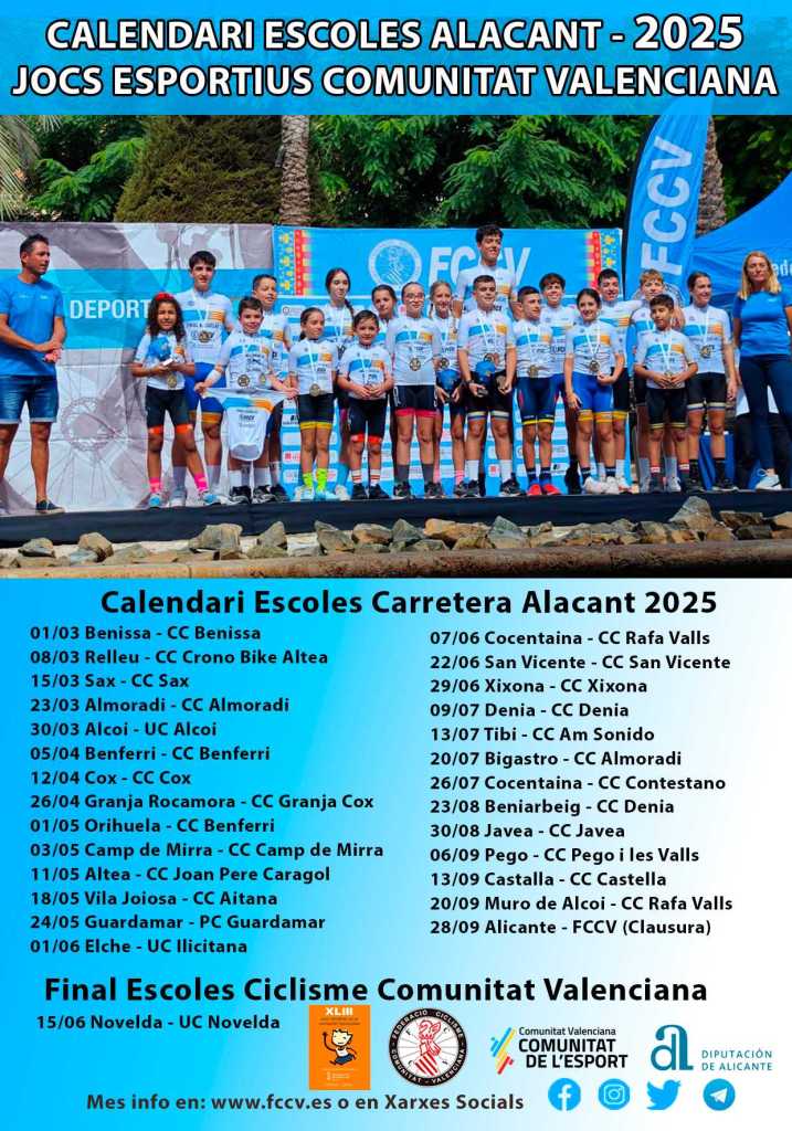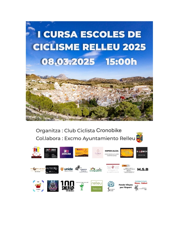 Relleu y Aiacor abren este fin de semana el calendario de las Escuelas de Ciclismo 2025 de las provincias de Alicante y València, respectivamente. La primera Cursa Escoles de Ciclisme Relleu se disputará el sábado, 8 de marzo, a partir de las 15 horas, organizada por el Club Ciclista Cronobike. 145 INSCRITOS.