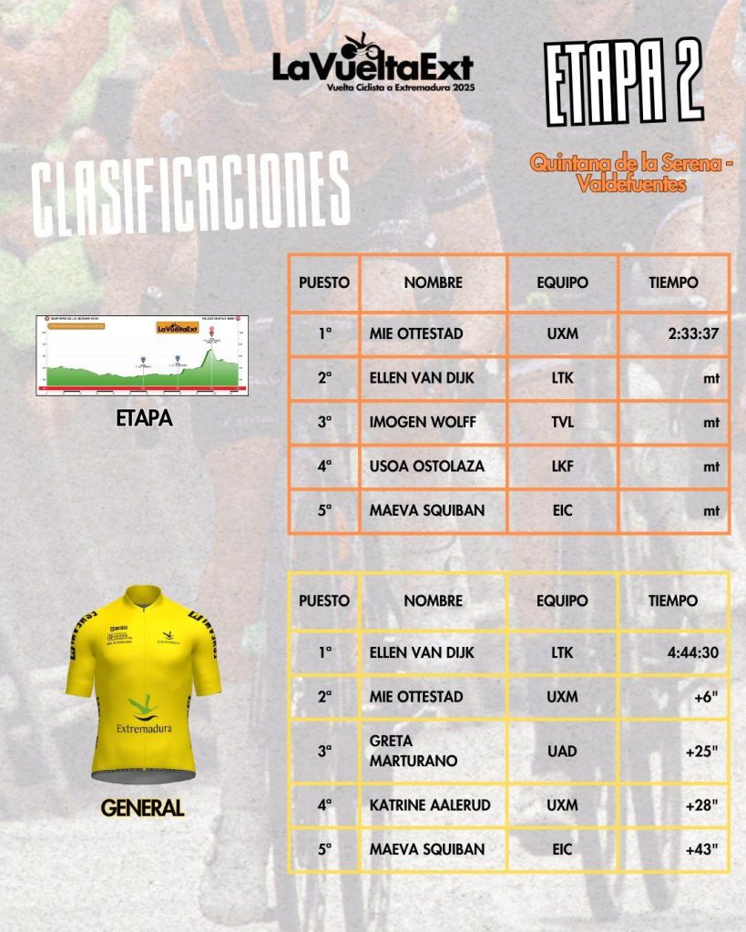 Mie Bjørndal Ottestad (Uno-X Mobility) se ha impuesto al sprint en la segunda etapa de la Vuelta a Extremadura Femenina , superando a la líder de la carrera Ellen van Dijk (Lidl-Trek) y a Imogen Wolff (Visma-Lease a Bike) en un sprint reducido en Valdefuentes. Sólo un pequeño grupo de unos 15 corredores disputó la final de la etapa de 109 km después de que una subida en los últimos 5 km dividió al pelotón en España. Usoa Ostolaza (Laboral Kutxa) termina cuarta. Van Dijk mantiene el maillot de líder de cara a la última etapa el sábado.