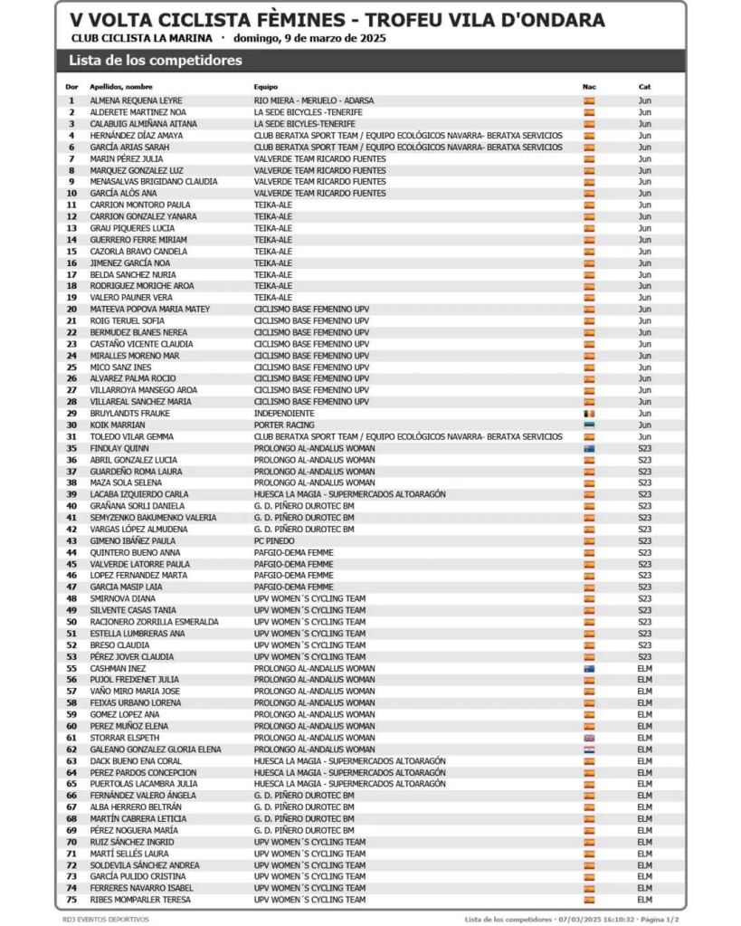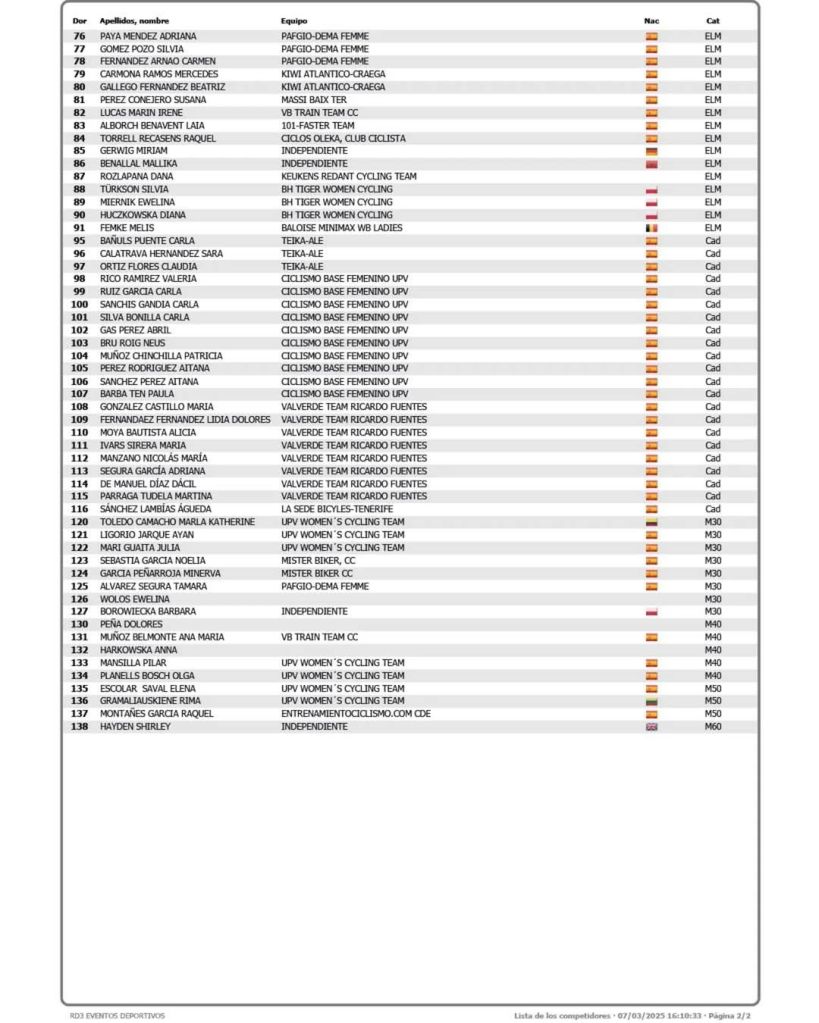 Son 138 las corredoras inscritas. Se enfrentarán a un exigente recorrido de 80 km en una jornada llena de emoción y ciclismo al más alto nivel. Estarán presentes los equipos de la Comunitat Valenciana y otras ciclistas como María Ivars o Adriana Segura.