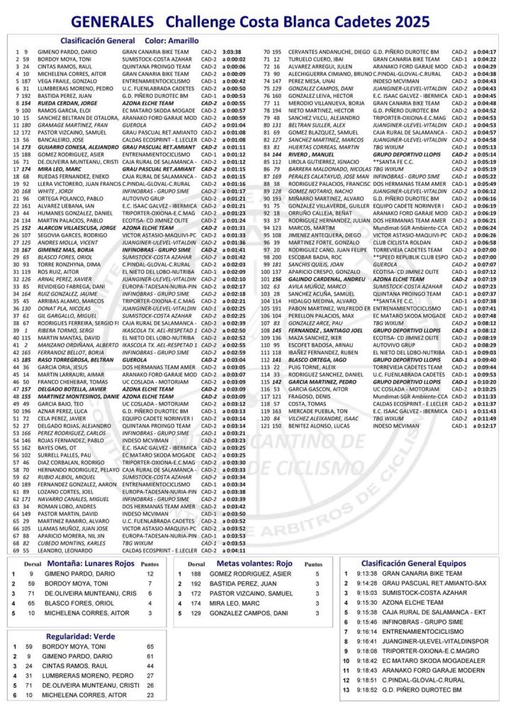 Darío Gimeno (Gran Canaria Bike Team) ha sido el ganador en Altea CRI final de la I Vuelta Ciclista Costa Blanca Cadete que constaba de 4,3 kilómetros de recorrido. Gimeno ha logrado la General final con dos segundos de ventaja sobre Toni Bordoy (Sumistock Costa Azahar). Bordoy se ha llevado la Regularidad; Gimeno la Montaña; Asier Gómez, las Metas Volantes; y Jorge Rueda (Azona Elche Team) se ha llevado los maillots de primer ciclista tanto de la provincia de Alicante como de la Comunidad.